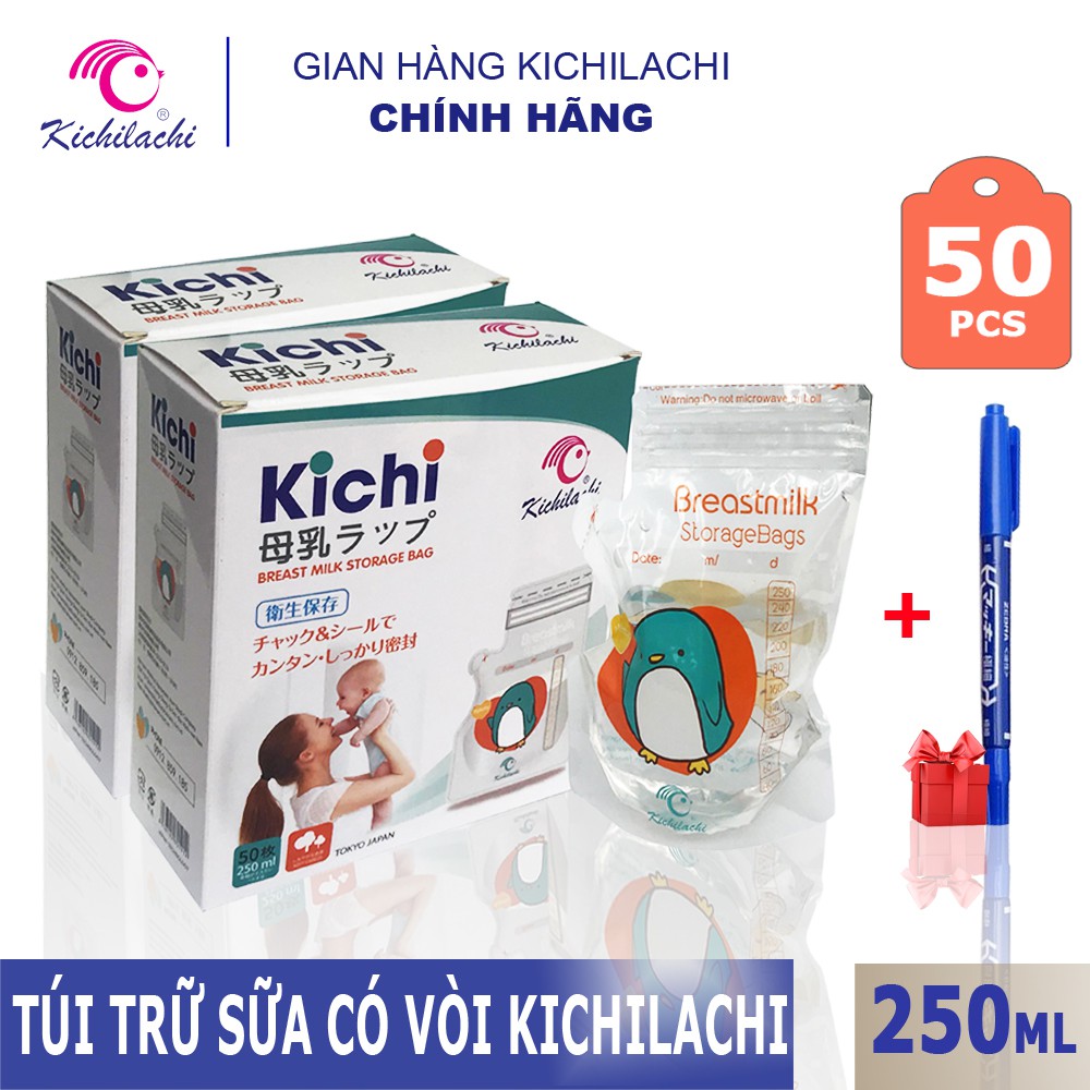 Túi trữ sữa Kichilachi 250ml Hộp 50 túi, có vòi (Tặng bút ghi mực dầu )